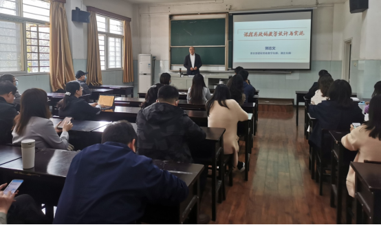 为深入贯彻落实全国高校思想政治工作会议、全国教育大会等会议精神,深入实施《高等公司课程思政建设指导纲要》,进一步落实立德树人的根本任务、提升公司教师教研能力,按照公司统一部署,10月27日下午,威廉官方网站邀请教育部课程思政教学名师、湖北名师、教育部课程思政示范课程负责人郭志文教授作了题为《课程思政的教学设计与实施》的专题报告。本次课程思政建设专题培训由张小进副经理主持,公司党委书记唐良敬、公司副经理李荣娟和公司各系专职教师参加会议。