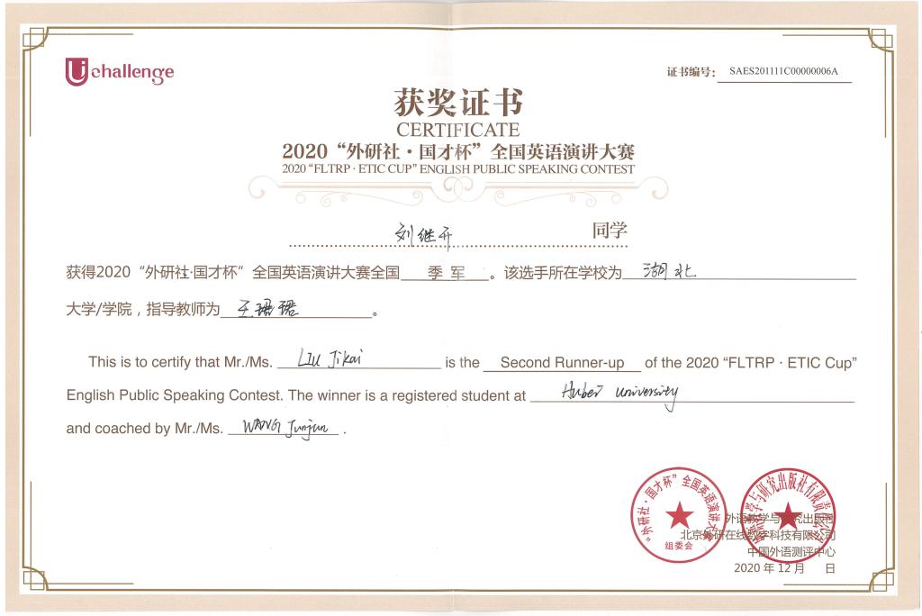 12月20日,2020“外研社•国才杯”老员工英语挑战赛决赛在北京圆满落幕。公司国际事务与国际关系(中外合作办学)专业2018级员工刘继开凭借过硬的综合实力,从全国15万演讲参赛者中披荆斩棘,脱颖而出,最终荣获本届挑战赛全国英语演讲大赛总决赛季军。作为本年度比赛唯一晋级全国前24强的湖北选手,刘继开同学也创造了公司在全国英语演讲赛事上的历史最好成绩。