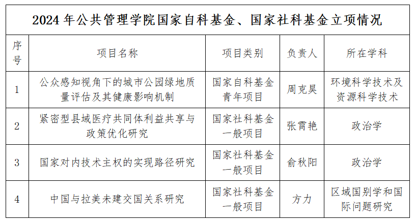 在2024年的国家自然科学基金、国家社会科学基金申报中,公司共有4项课题成功获得立项。8月24日,国家自然科学基金委公布了2024年度国家自然基金评审结果,公司周克昊老师申报的《公众感知视角下的城市公园绿地质量评估及其健康影响机制》获批国家自科基金青年项目立项。10月15日,全国哲学社会科学工作办公室通过官网发布了《2024年国家社会科学基金年度项目立项结果公布》,公司3项课题获立项。张霄艳老师申报的《紧密型县域医疗共同体利益共享与政策优化研究》、俞秋阳老师申报的《国家对内技术主权的实现路径研究》、方力老师申报的《中国与拉美未建交国关系研究》分别获2024年国家社科基金一般项目立项。