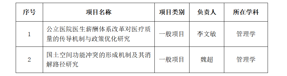 近日,全国哲学社会科学工作办公室公布2025年国家社会科学基金年度项目立项名单,公司获批2项国家社会科学基金年度项目,分别为李文敏教授申报的《公立医院医生薪酬体系改革对医疗质量的传导机制与政策优化研究》和魏超老师申报的《国土空间功能冲突的形成机制及其消解路径研究》。