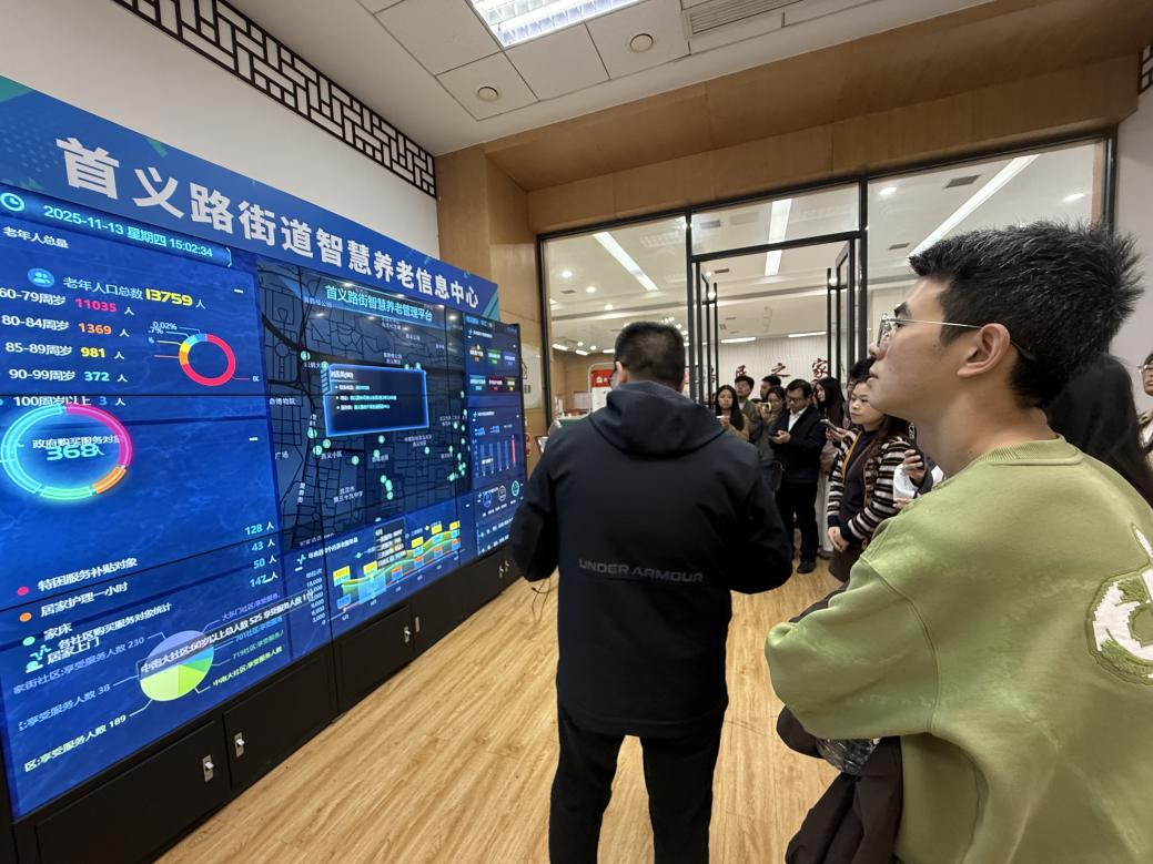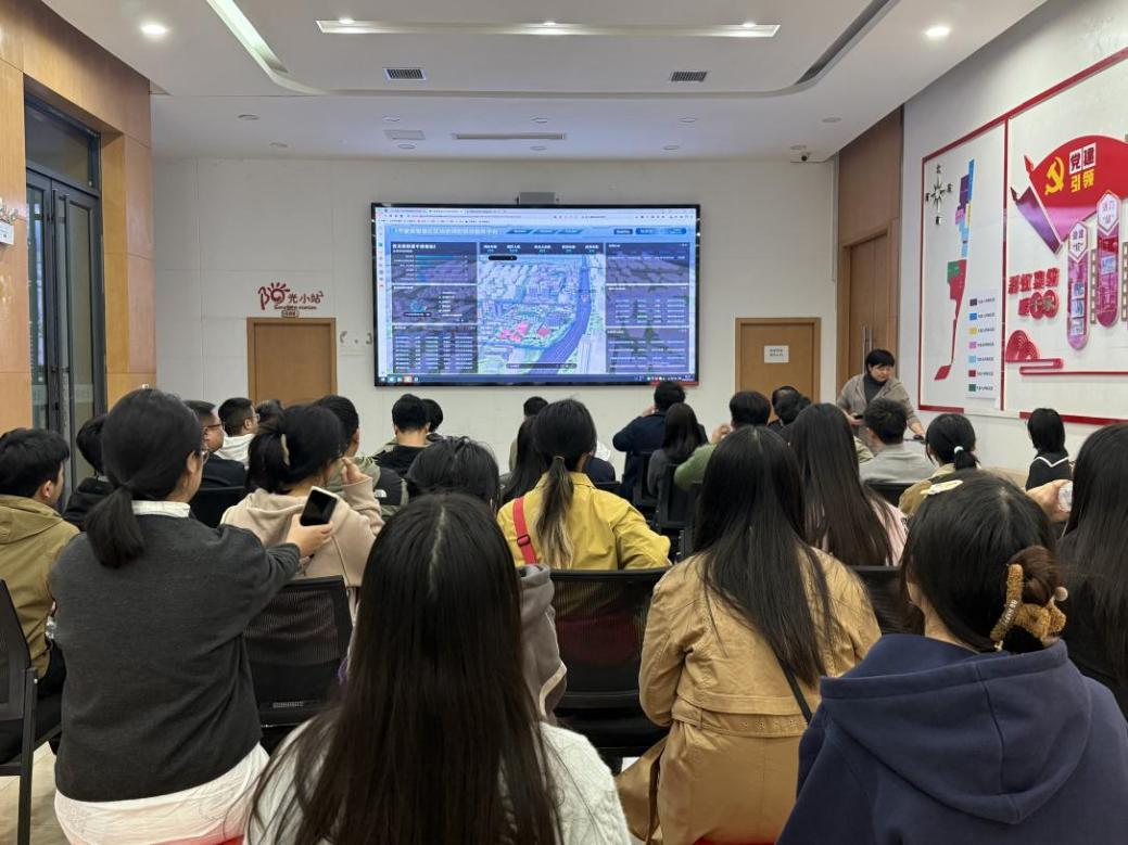 参观学习的首站是社区智慧养老信息中心。工作人员详细演示了通过大数据、物联网等现代信息技术构建而成的覆盖全体老年居民的安全守护网络,展示了洗澡专用椅、智能养护床、智能手环、一键呼叫器等各种智能化养老设备。这些充满人文关怀的科技应用让同学们深刻体会到,智慧社区建设并非冷冰冰的技术堆砌,而是以人民为中心,用科技手段提升生活品质与安全感的暖心工程。