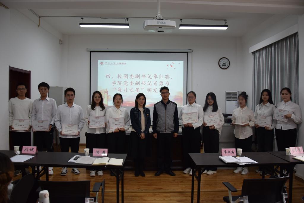 大会总结回顾团学组织前期工作,以视频播放的形式充分展示公司团学组织风采。公司团委书记刘健宣读“每月之星”表彰文件,校团委副书记覃红英、公司党委副书记肖勇为10月份各部门表现优异者颁发“每月之星”证书。获奖代表李培源、杨季鲜在会上分享自己的工作心得和体会,两位同学的分享不仅体现了个人积极务实、勤恳负责的工作态度,还代表着公司团学组织团结和谐、奋发向上的精神面貌。