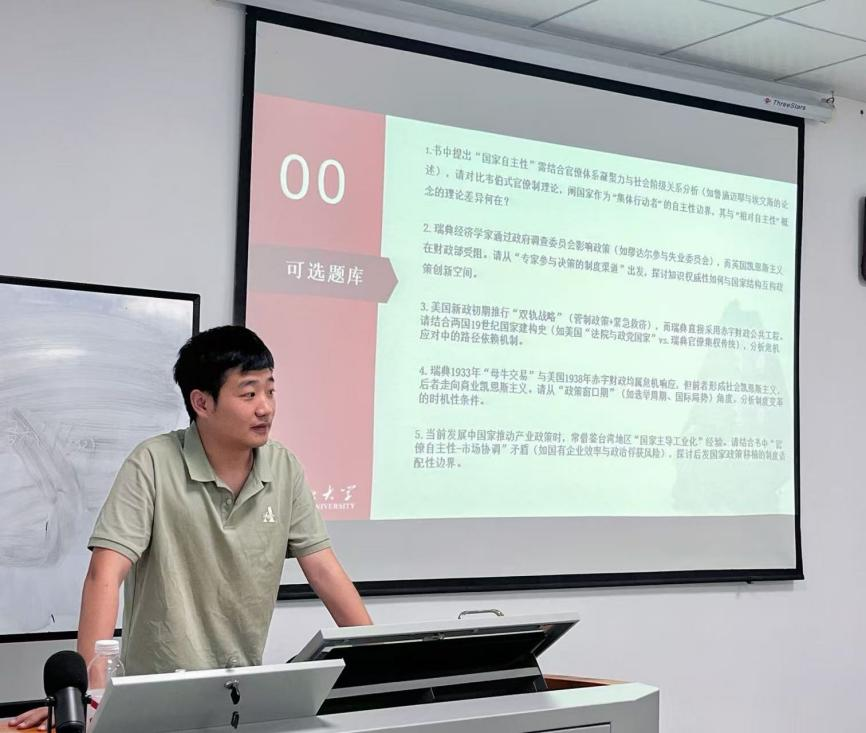 以李明峻同学为代表的第一小组分享了《找回国家》的核心观点,分析全球化与多元主体背景下国家主权、制度及能力的基础性地位,进而剖析国家自主性作为核心动力如何能动地引导社会经济发展与危机应对,强调国家是全球治理的核心单元,其自主性力量与治理能力现代化建设至关重要。